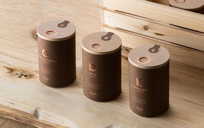 咖啡圆形包装的灵感来自一台老式烘焙机的外观,它的形状通常是圆柱形,前侧有一个圆形温度计。设计师将这些典型的细节转化为独特而可爱的包装设计,以传达新鲜烘焙咖啡豆的理念。在整个烘焙过程中,一个简短的标志版本被设计成象征流通的咖啡豆。每种混合物都有自己的名字和一个大写字母,以便快速识别。因此,字母E用于Espresso,G用于Grani Naturali等。只有天然材料被用于不同颜色的棕色,以传达传统的烘烤工艺,最重要的是咖啡本身。