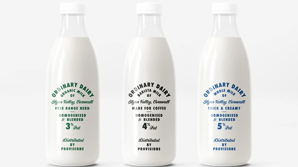 在品牌标志设计上的拱形文字让人联想到牛群放牧的连绵起伏的丘陵,而字面上的表情则说明牛奶的乳脂状。标志的实用色系用于指示不同的品种。普通乳制品生产全脂有机咖啡师奶。