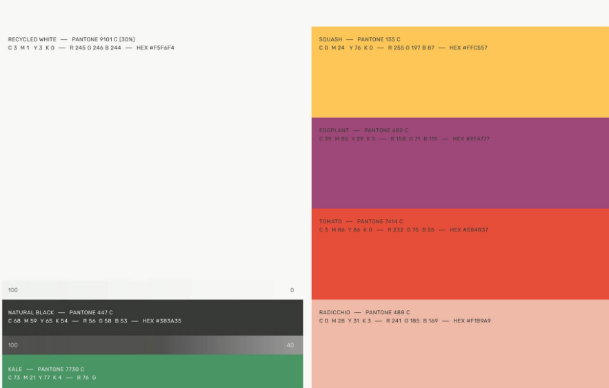 新的调色板的灵感来源于自然界中的颜色和纹理,特别是那些在农场中发现的颜色和纹理。原色的再生白色,天然黑色和甘蓝是核心品牌的颜色,应该使用时,介绍品牌,并突出以后。一种地球色调的混合物,与明亮的颜色并排。非白色和非黑色,因为自然界中没有纯白色或纯黑色这样的东西。