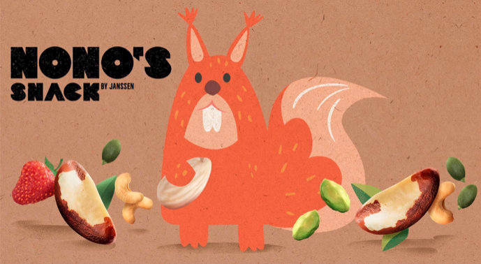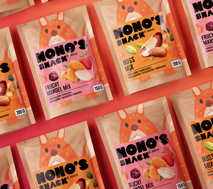 家族企业通过推出更多产品系列来征服零售市场,开启了品牌和企业形象设计的现代化进程。 “诺诺的小吃”就是这样诞生的。方便的零食有两种:坚果混合和坚果水果混合。这个概念的灵感来自一只非常挑剔的松鼠,诺诺,他是一个大坚果和水果爱好者。由 Nono 亲自挑选,每袋只包含最好的坚果和水果——100% 松鼠认证。在品牌设计理念上,Nono在背包正面的位置非常突出,不容错过。由于它作为坚果专家和收藏家的角色,它很快决定以厚脸皮的松鼠为主角。这种迷人的动物应该让健康的零食成为一种有趣的选择——并表明好食物不需要无聊,零食也不需要导致良心不安。该设计将年轻的快乐与现代的外观相结合,对年轻人和老年人都有吸引力。