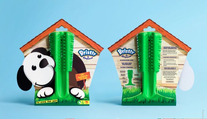 一款革命性的狗用“自己动手”刷牙棒,完美契合狗的咀嚼行为和解剖结构,鼓励自然清洁牙齿,将不愉快的日常工作变成一场游戏。产品的VI设计必须与它最明显的优势特征相关联,那就是刷毛。因此,我们想出了创造性的、统一的和描述性的词“Bristly”。它与产品完美契合:一种天然橡胶玩具,上面覆盖着刷毛线凹槽,这是给幼犬刷牙的主要工具。品牌VI设计是为了展示过程本身:插图中的狗正在愉快地咀嚼棒子,它描述了产品背后的主要思想,互动式和“自己动手”刷牙程序的方式。