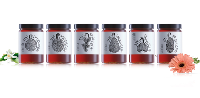 蜂蜜品牌标志设计的脸通过简单的绘画变得栩栩如生,就像在白纸上用铅笔和几乎幼稚的刻字一样。同样的简单性也适用于天然成分的绘制,这些天然成分为这款珍贵产品的 6 种变体赋予不同的颜色和香气。