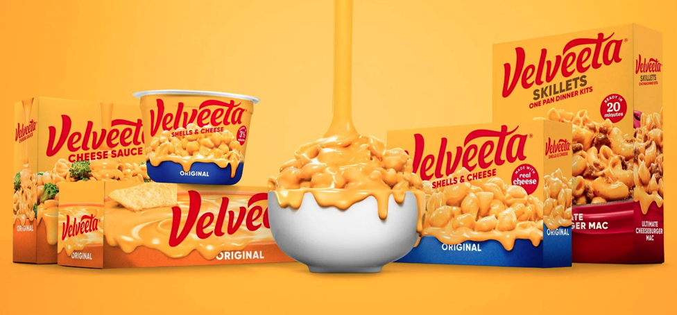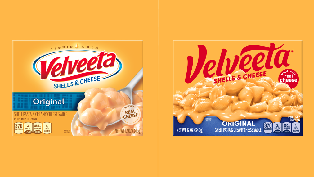 卡夫亨氏是该品牌形象设计二十年来的第一次重大更新。品牌形象设计的核心元素仍然存在,尤其是标志性的黄色,而字标仍然是红色。但现在标志去掉了多余的部分,去掉了“液态金”标语、破碎的圆形框架和品牌名称底部的下划线。没有了 oh-so-aughts 渐变和阴影,标志是一个更平坦、更简约的东西,通过更新的更流畅的排版保留了华丽和风格。 Velveeta 字标像圆形的液体奶酪一样流动,表达了将奶酪酱倒在您的食物上的放纵乐趣。