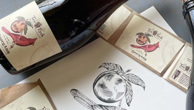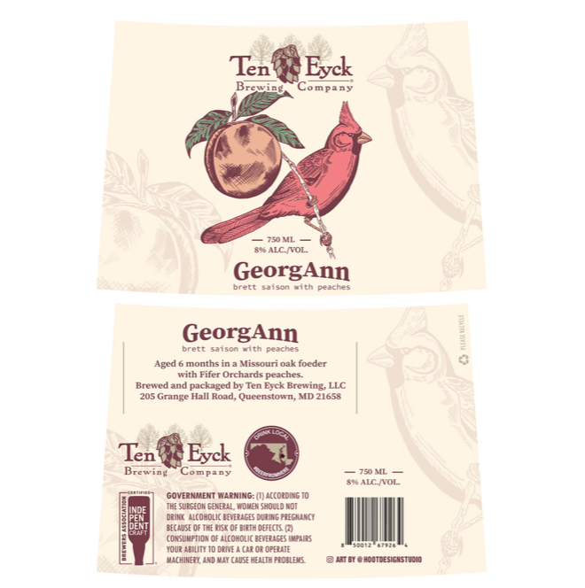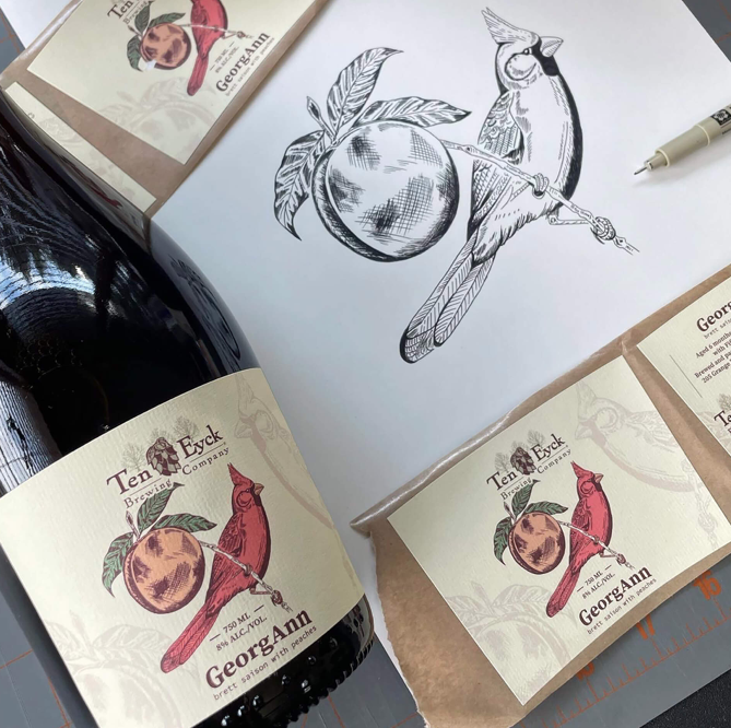 啤酒标签设计的特点是传统上用钢笔和墨水绘制的红衣主教手绘插图。这只鸟代表着酿酒厂老板的姑姑乔治安,而桃子则吸引你去品尝这个软木塞和笼子里的味道!