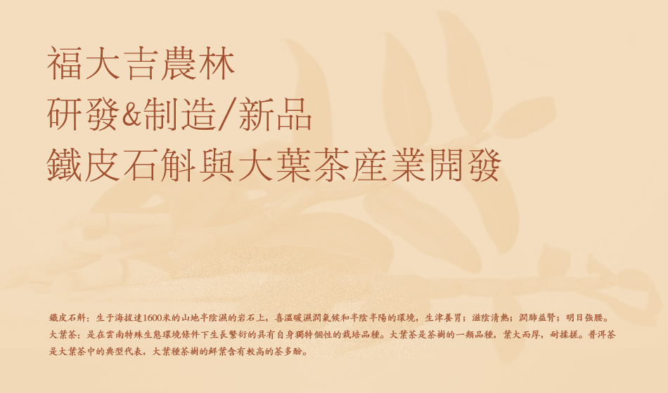 铁皮石斛:生于海拔达1600米的山地半阴湿的岩石上,喜温暖湿润气候和半阴半阳的环境,生津养胃;滋阴清热;润肺益肾;明目强腰。大叶茶:是在云南特殊生态环境条件下生长繁衍的具有自身独特个性的栽培品种。大叶茶是茶树的一类品种,叶大而厚,耐揉搓。普洱茶是大叶茶中的典型代表,大叶种茶树的鲜叶含有较高的茶多酚。